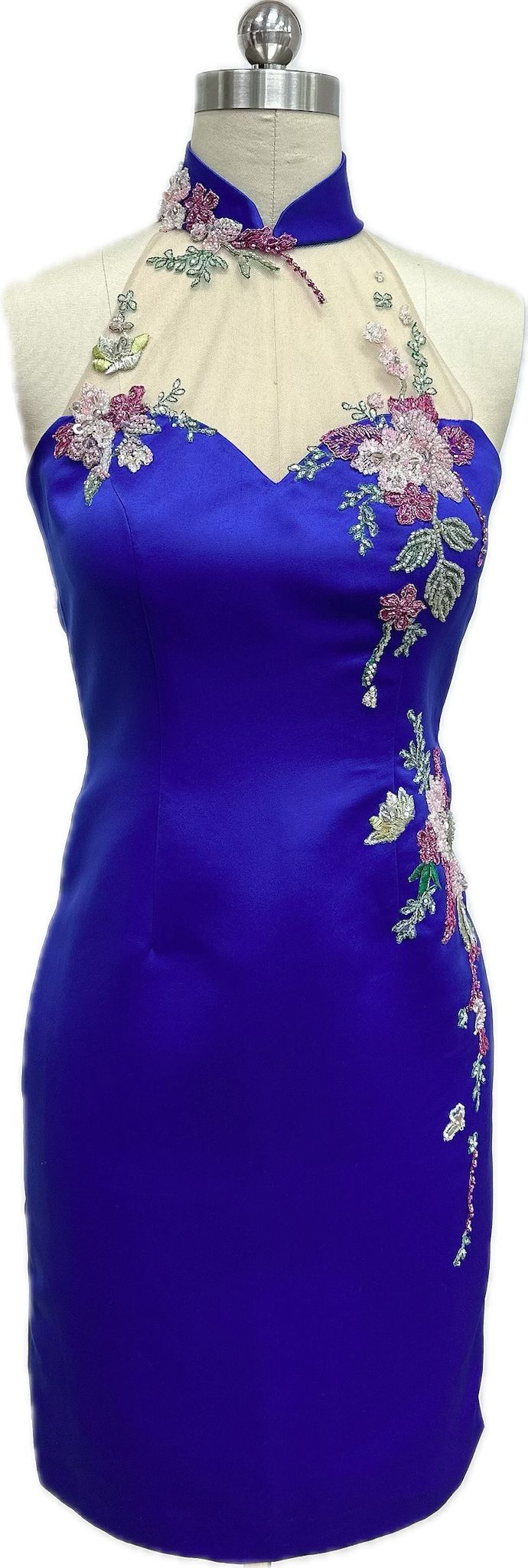 This cheongsam is a bold, modern design in vibrant royal blue with an elegant, feminine finish. It features a halter-style mandarin collar and a sheer mesh neckline richly embellished with beaded floral embroidery. The fitted silhouette highlights the body, while the dramatic open-back oval cutout, framed with matching floral embroidery and secured with pearl buttons at the collar, adds a striking contemporary touch.