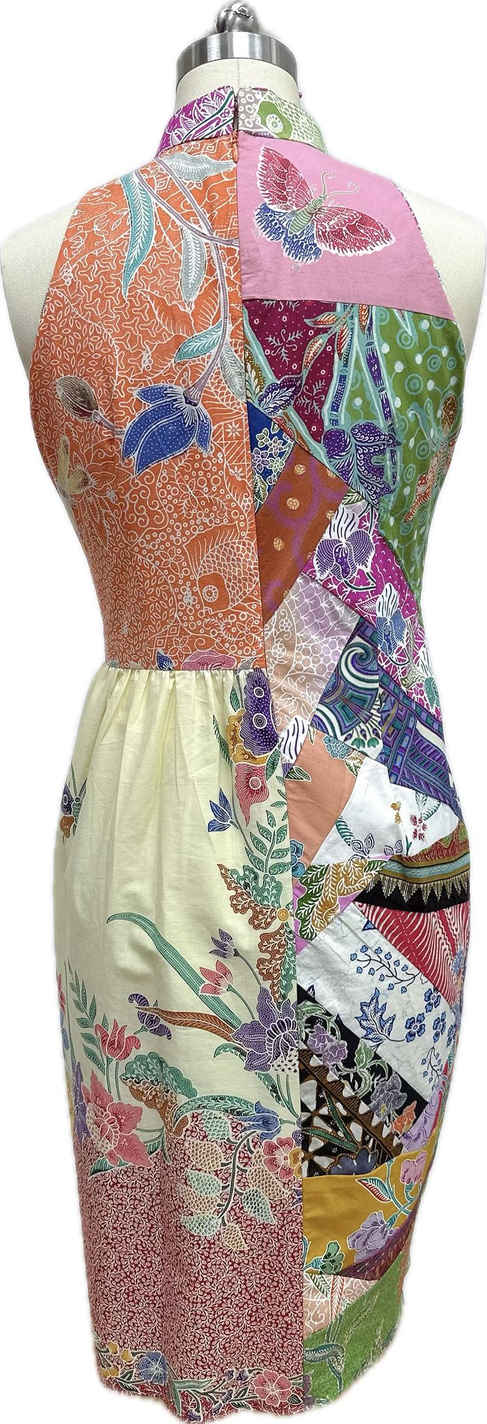 This cheongsam showcases a lively patchwork of Peranakan-style batik prints in bright pinks, purples, yellows, and greens. Featuring bold floral motifs, a contrasting mandarin collar, and traditional knot buttons with back zip opening. It has a playful, handcrafted look with a gathered skirt panel that adds softness and movement.