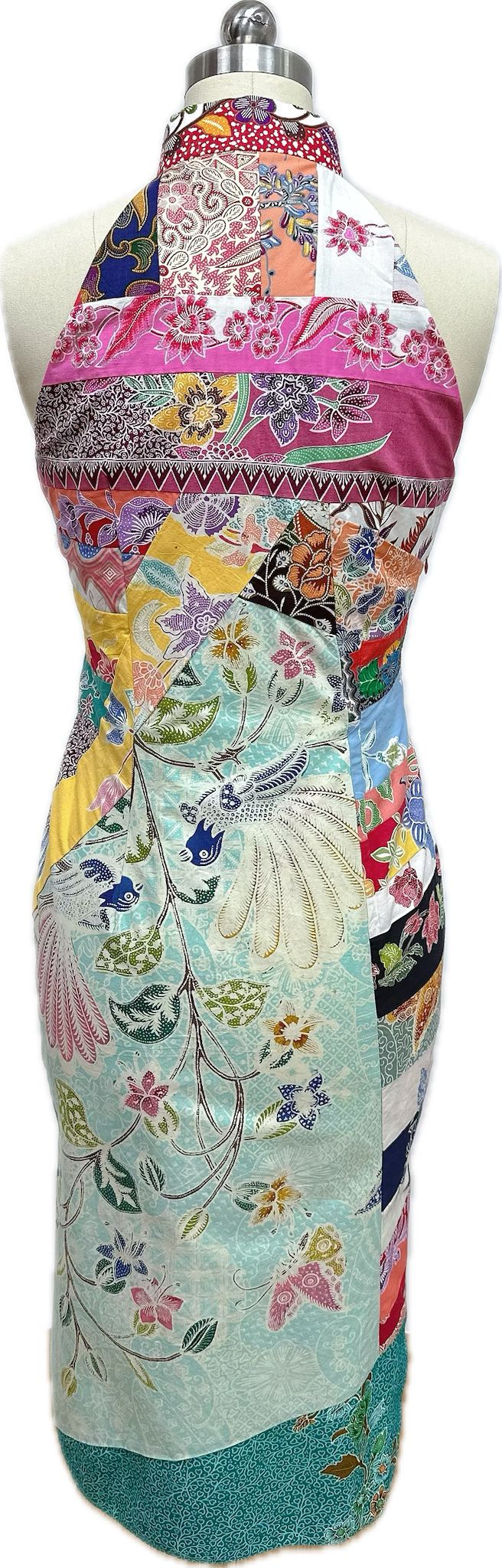 This is a colourful patchwork batik Cheongsam with a vibrant halter neckline with side buttons and zip opening, featuring bold diagonal batik stripes in red, orange, purple, and white. It has a mixed floral panels at back creating an artistic, eclectic design for a lively, festive look.