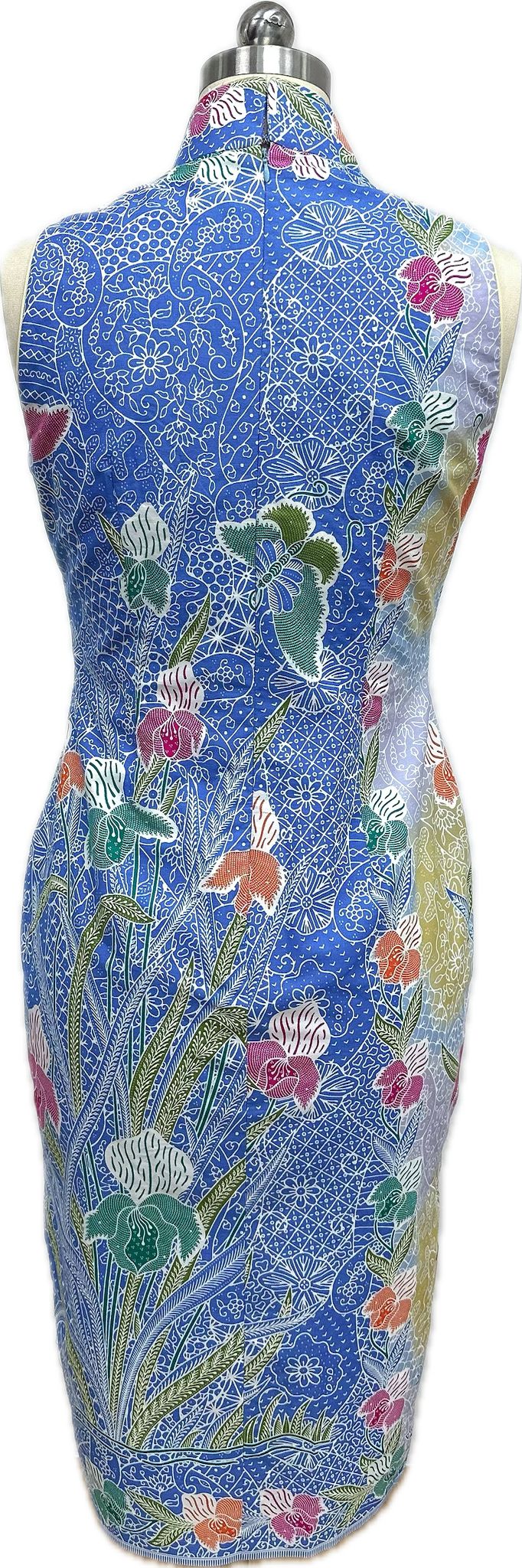 This cheongsam features a vibrant blue batik print with intricate white linework and multicoloured floral motifs. The V-style neckline with a invisible back zip closure, and form-fitting silhouette give it a sleek, modern elegance combining traditional and contemporary elements for a unique cultural look.