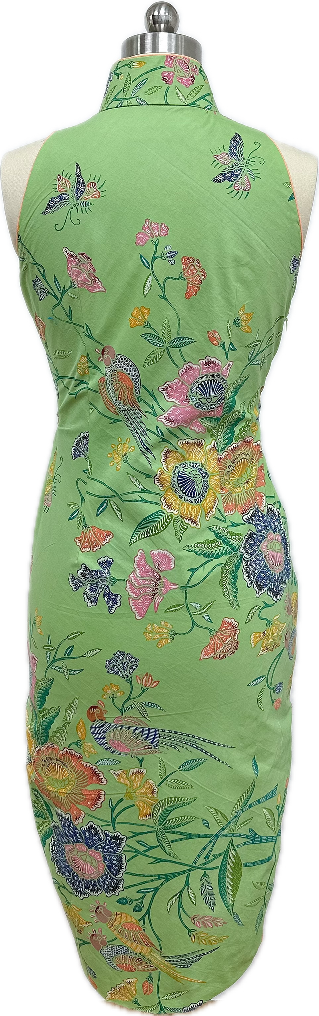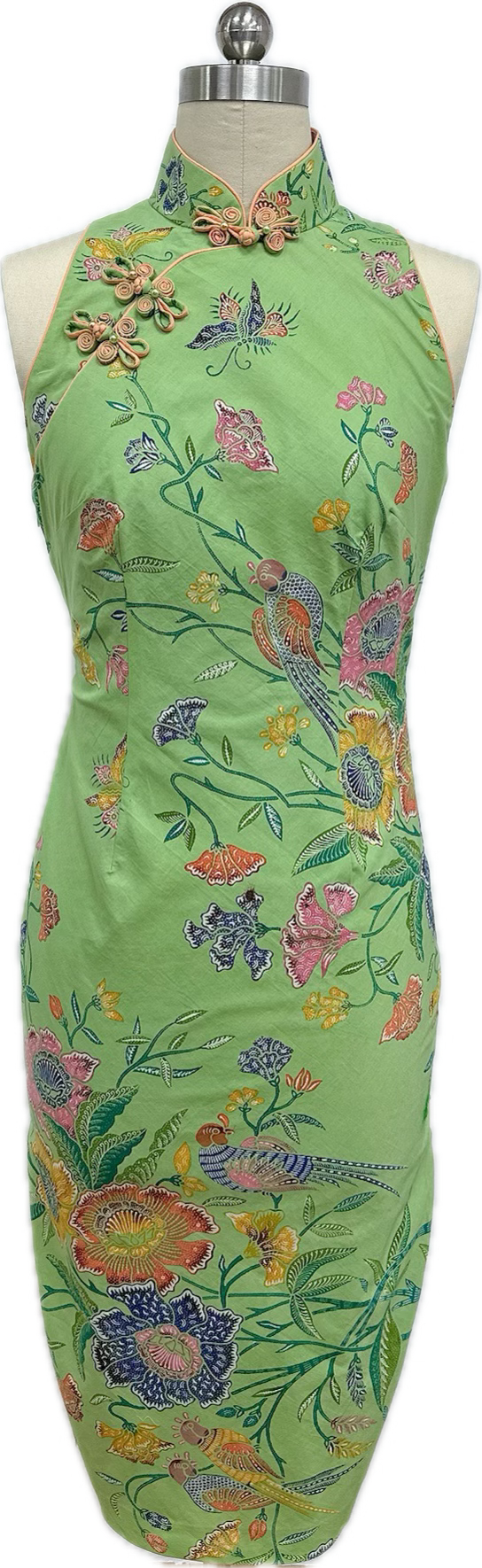 A fresh light-green sleeveless cheongsam adorned with colorful floral, butterfly and bird motifs. It features a high mandarin collar with peach Chinese pankou buttons with side zip opening and a fitted silhouette, combining elegance with a vibrant, nature-inspired design