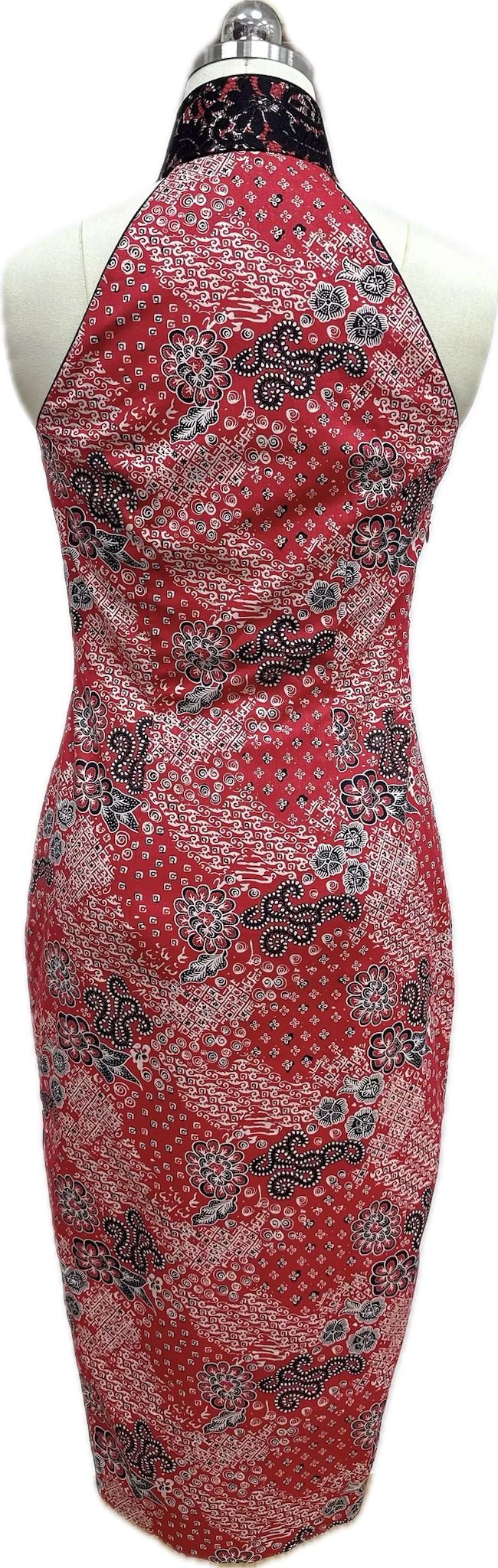 This is a halter neck, form-fitting cheongsam (qipao) featuring a red base with black and white floral and geometric patterns. It has a high mandarin collar, Chinese floral button with a side zip closures, and an asymmetrical black lace panel across the shoulder for added elegance.