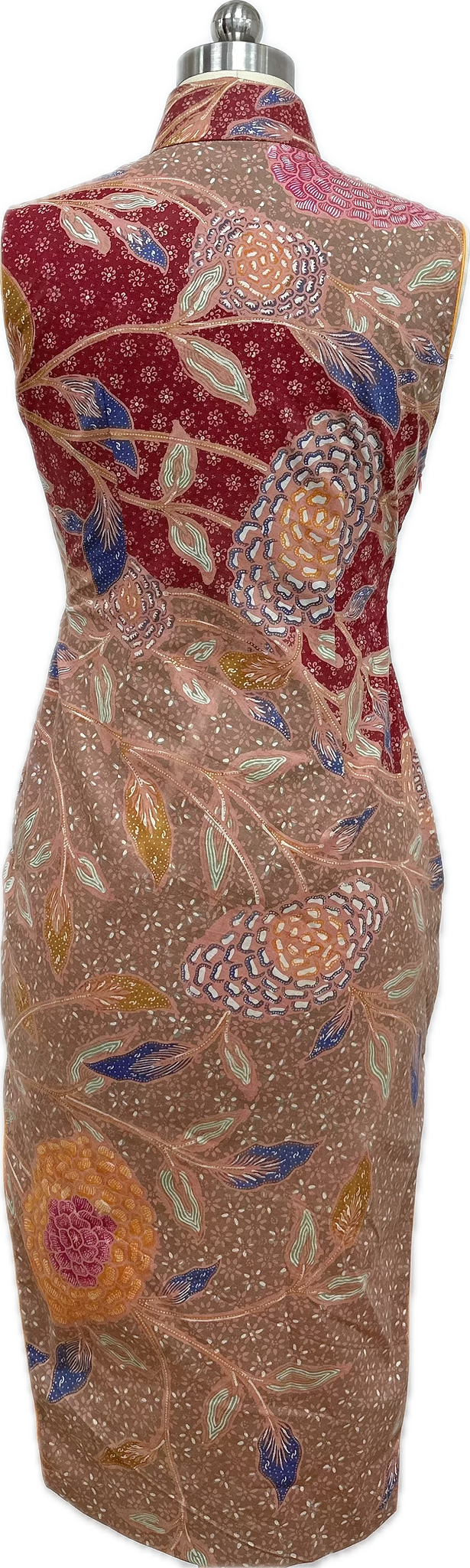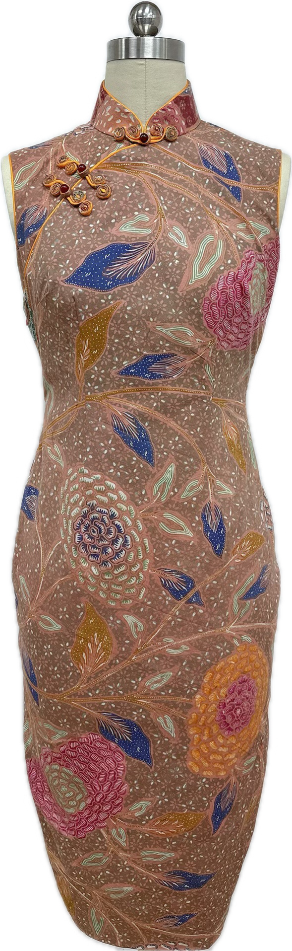 A sleeveless brown cheongsam featuring a delicate batik-inspired floral pattern. The design includes intricate blossoms and flowing leaf motifs, complemented by decorative knot buttons and subtle golden piping with side zip opening, for an elegant and handcrafted look