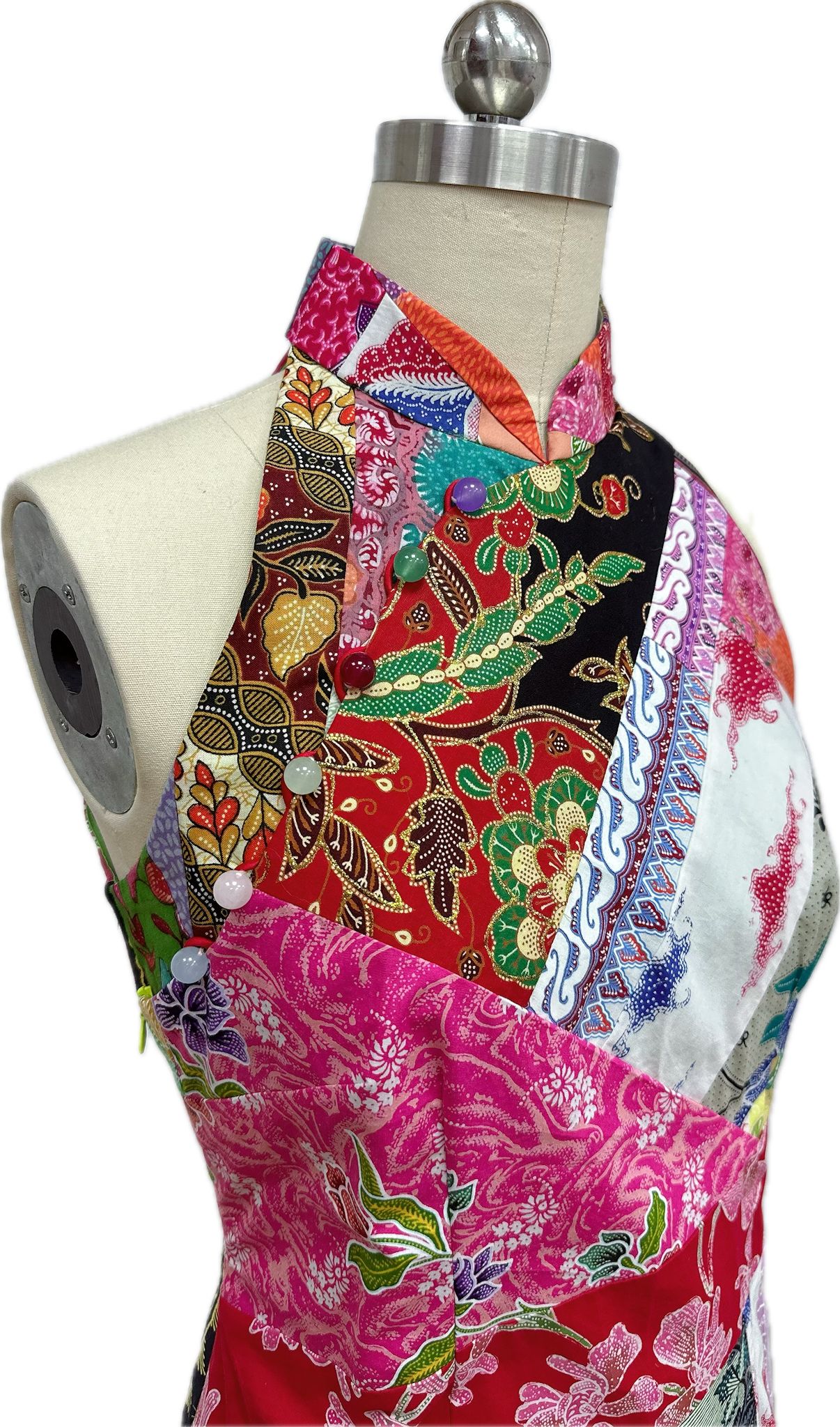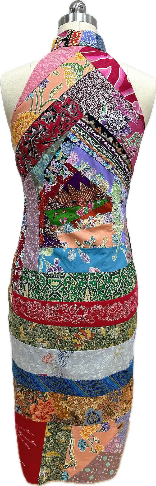 This piece features a vibrant patchwork design made from various traditional batik fabrics in diagonal and vertical panels. The sleeveless, halter-neck with side zip opening, silhouette is form-fitting, with a visually striking mix of florals, abstract, featuring bold floral and geometric patterns in a mix of bright colors for a striking, artistic look.