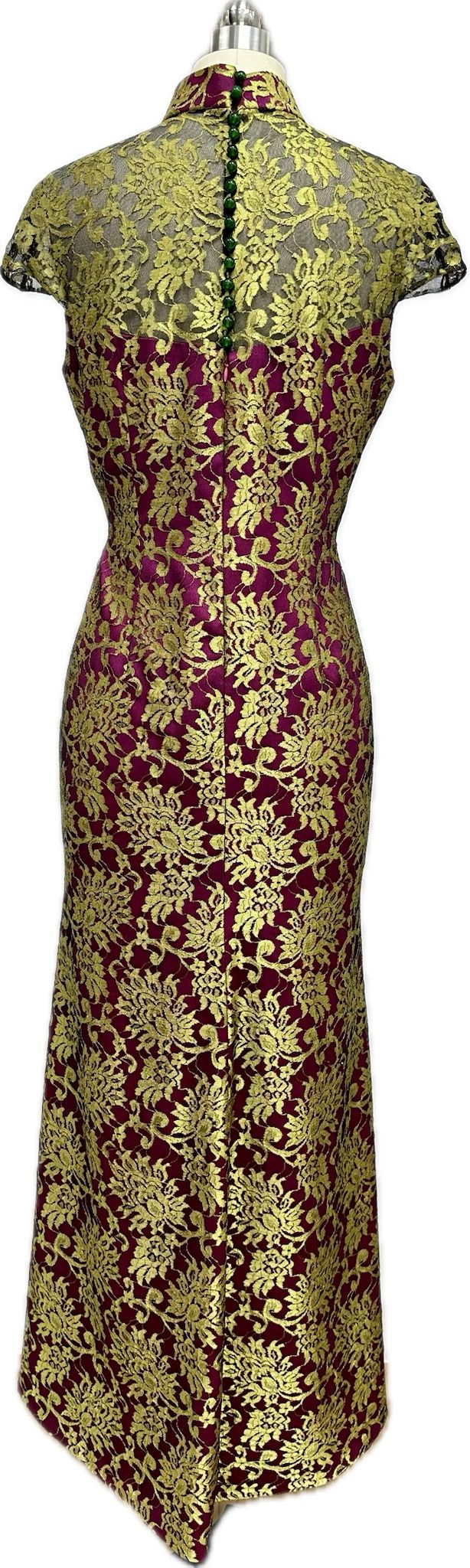 This cheongsam is a floor-length, body-hugging dress made of rich maroon fabric overlaid with intricate golden floral lace, and beautiful jade buttons with a zip closure at back. The high collar and cap sleeves retain traditional Chinese styling, while the sheer lace at the upper chest and shoulders adds a delicate, elegant touch. The overall design is regal and ornate, ideal for formal occasions or festive celebrations.