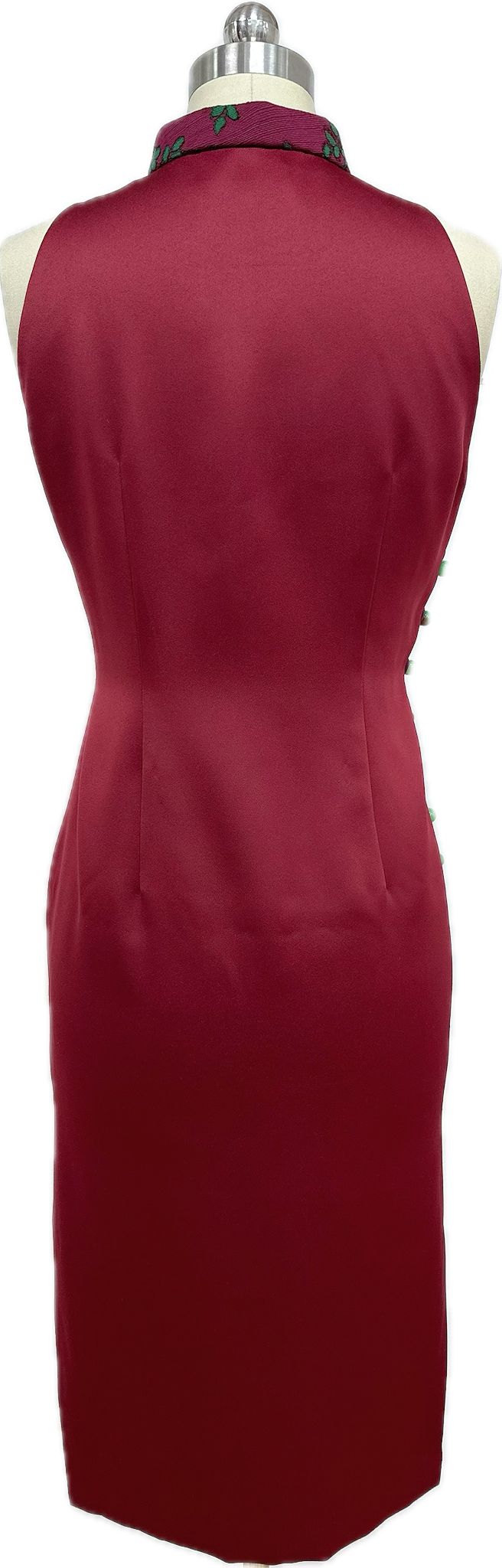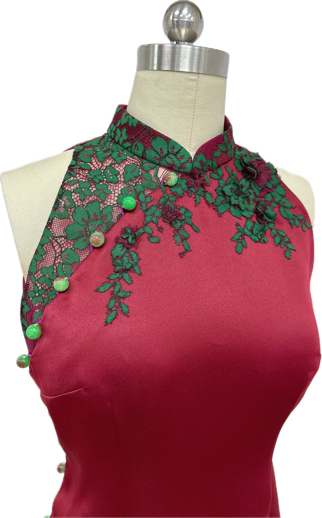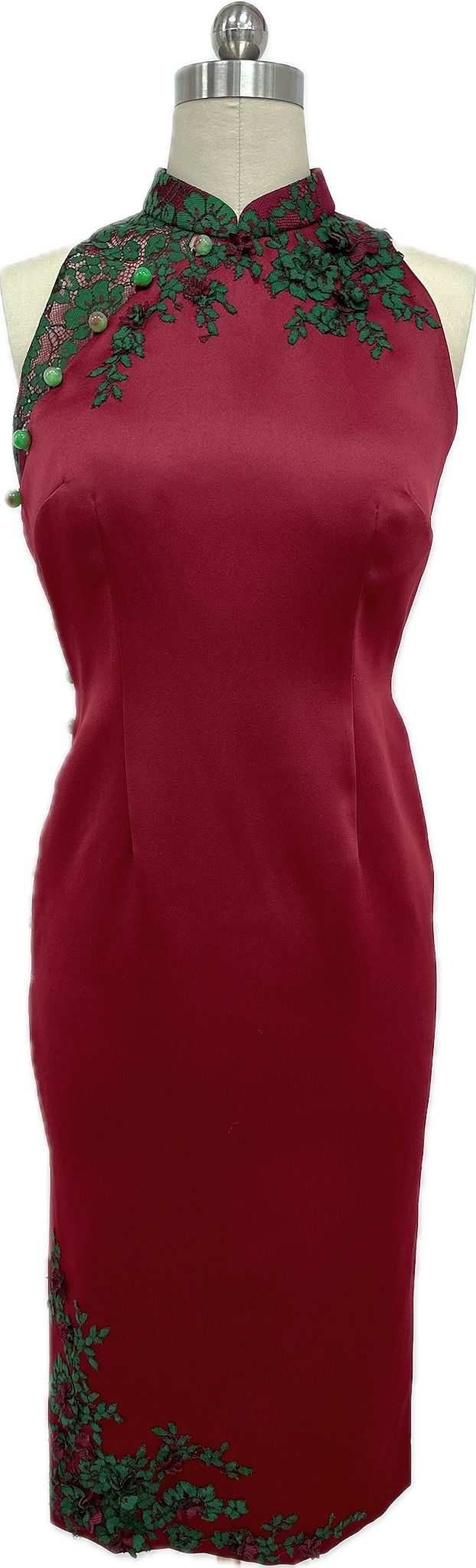 A graceful burgundy cheongsam featuring a sleeveless cut, classic stand collar, and elegant diagonal button closure. Delicate green floral lace embroidery accents the neckline and hem, adding a refined contrast to the sleek, figure-flattering silhouette.