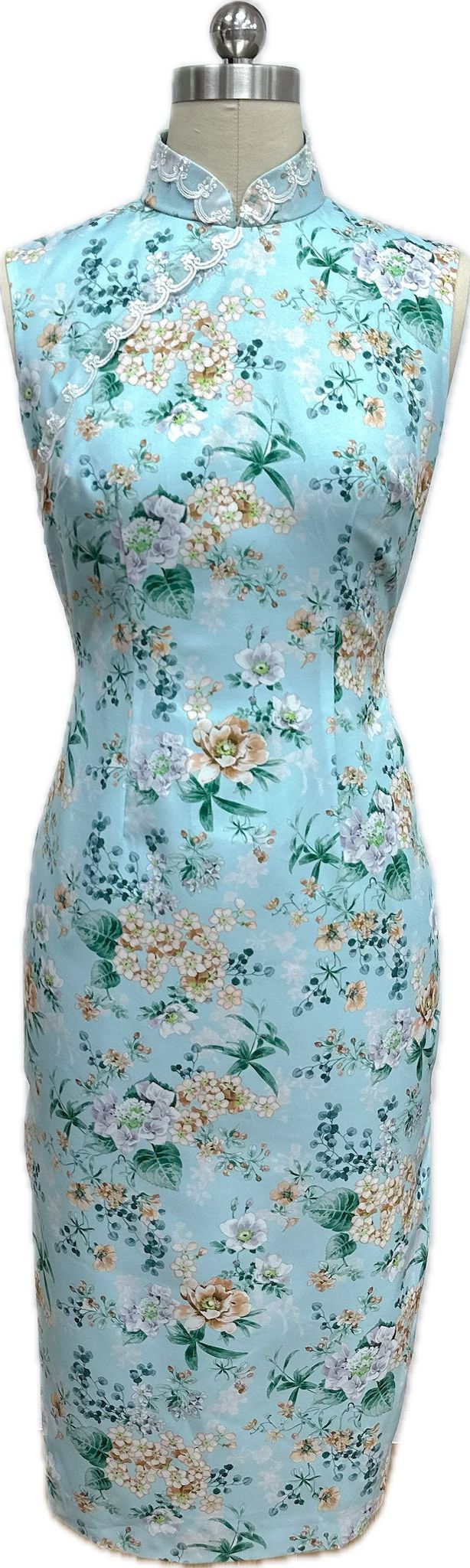 This cheongsam showcases a graceful, fitted silhouette in a soft powder-blue tone adorned with an all-over delicate floral print. It features a high mandarin collar with an asymmetrical lace-trimmed with side zip closure, sleeveless styling, and smooth tailoring that enhances its elegant, feminine appeal.